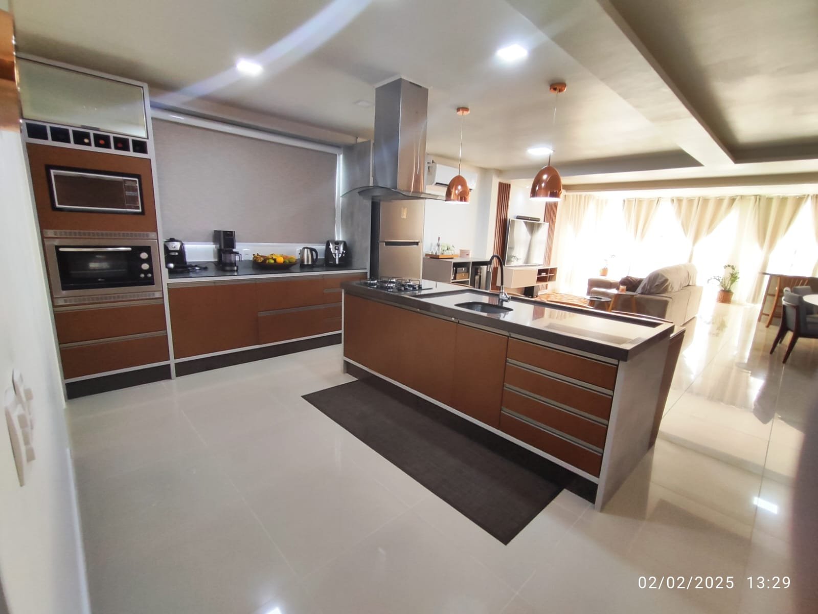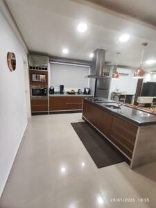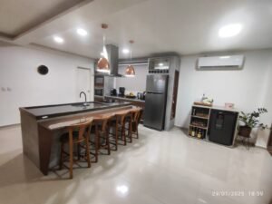Cozinha em conceito aberto integrada à área gourmet com churrasqueira